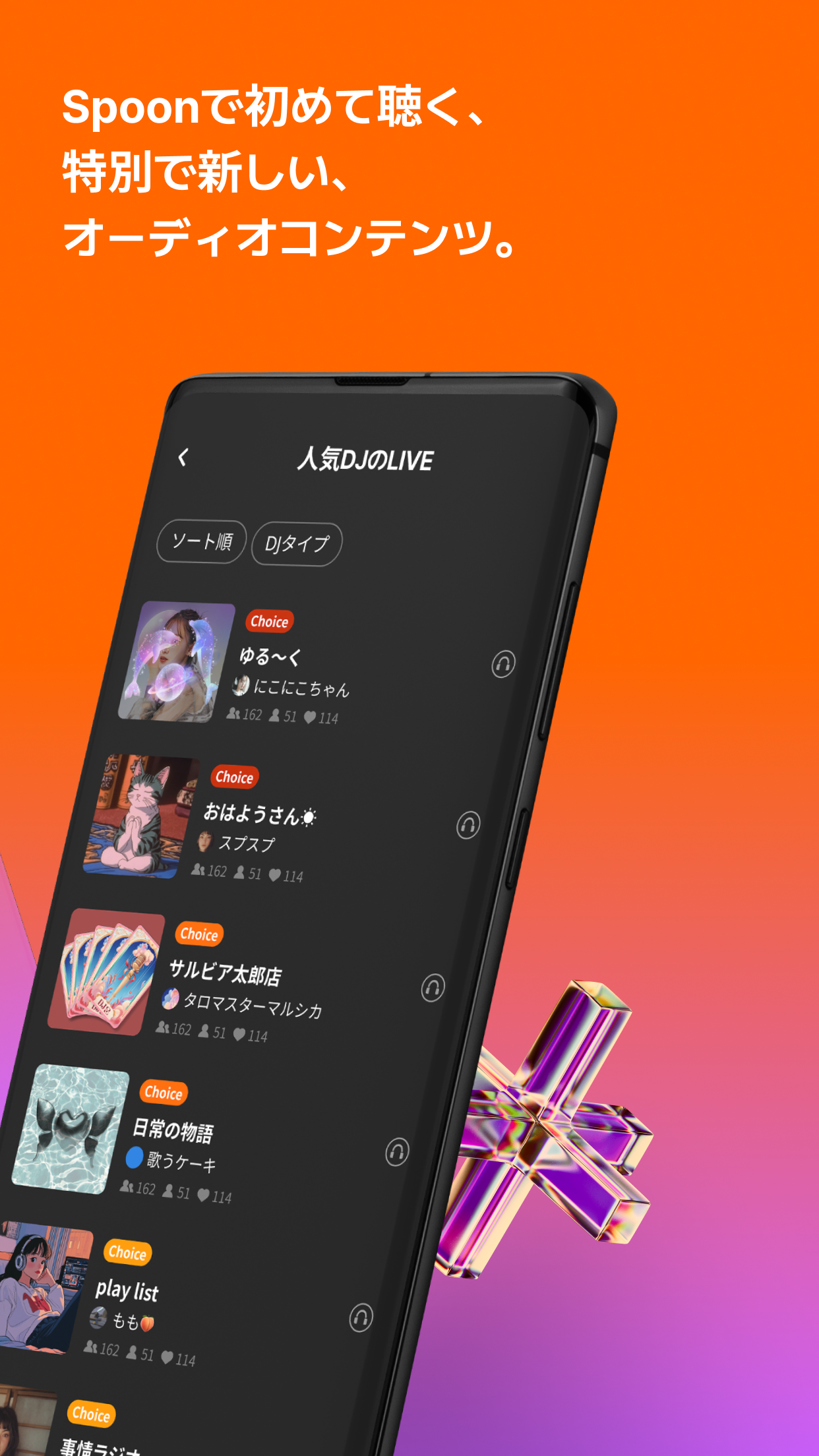 Spoon(スプーン)は、音声のみで配信・視聴ができるリアルタイム型のオーディオライブ配信アプリです。映像を使わず「声」だけでコミュニケーションを取る仕組みなので、顔出しに抵抗がある人や、作業をしながら配信を楽しみたい人から高い支持を集めています。