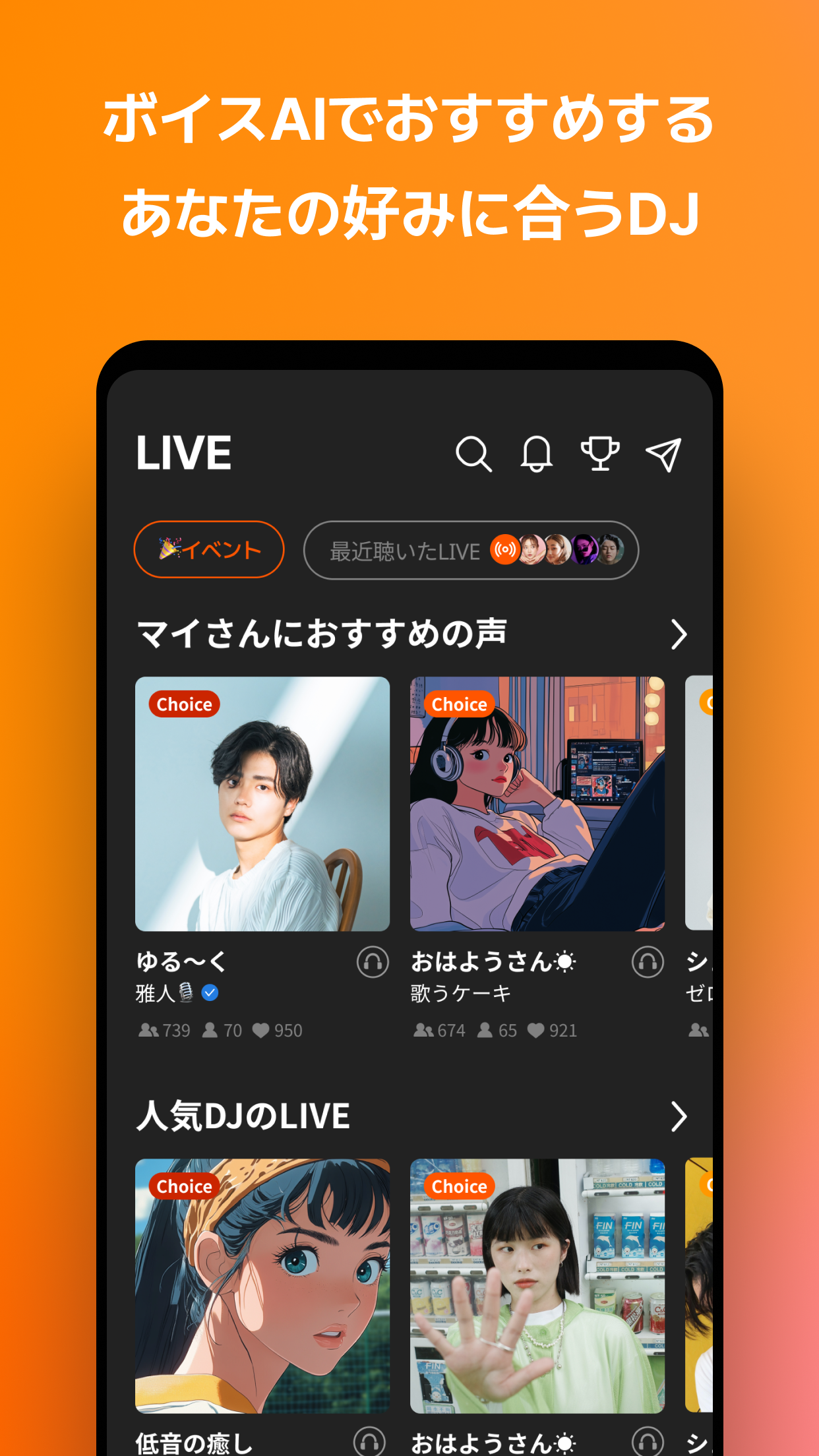 「何を聴けばいいかわからない」という初心者でも、トピックを選ぶだけでおすすめのLIVEが表示されるため、迷わず利用できる点が魅力です。