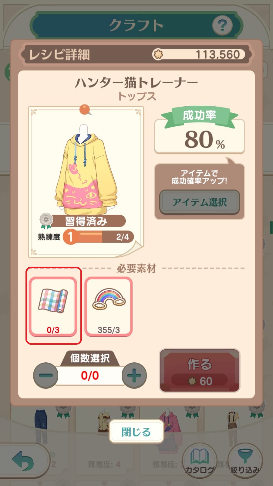 クラフトを繰り返すとレベルが上がり、作れるアイテムの種類が増えていきます。さらに、一定期間後には、過去のガチャ限定アイテムもクラフト可能になり、無課金プレイヤーでも時間をかければ、憧れのコーデを揃えられます。