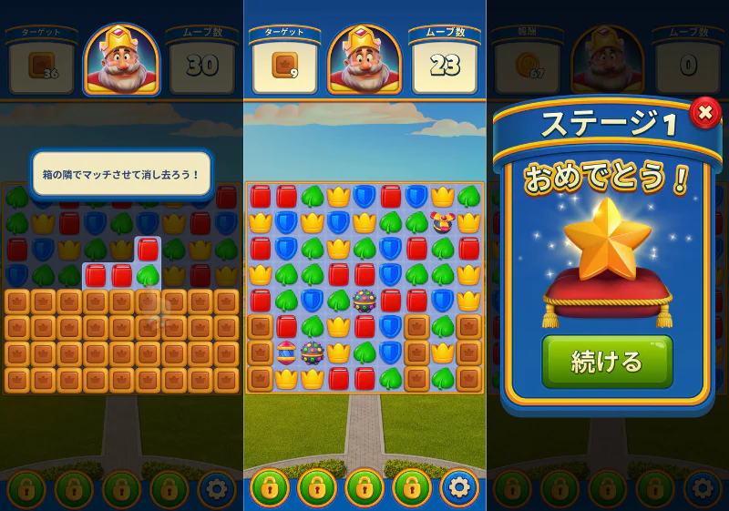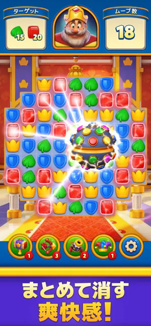 ロイヤルマッチは、同じ絵柄のブロックを縦か横に3つ以上揃えて消していくマッチ3パズルゲームです。