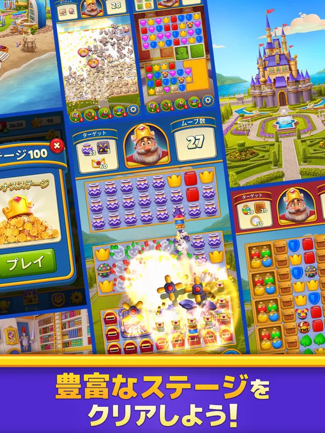 ロイヤルマッチは、パズルを解いて王様を救って、豪華なお城を建てる3マッチパズルゲームになります。